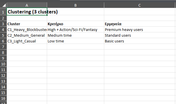 • Ερμηνεία: Χρήστες με έντονη χρήση, τυπικά “binge” περιεχόμενο, ταιριάζουν συχνά με Premium.
