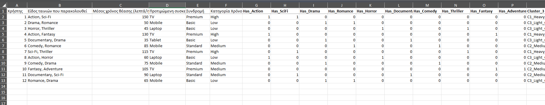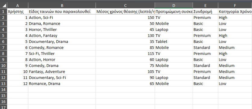 Χρήστης Είδος ταινιών που παρακολουθεί Μέσος χρόνος θέασης (λεπτά/ημέρα) Προτιμώμενη συσκευή Συνδρομή Κατηγορία Χρόνου
