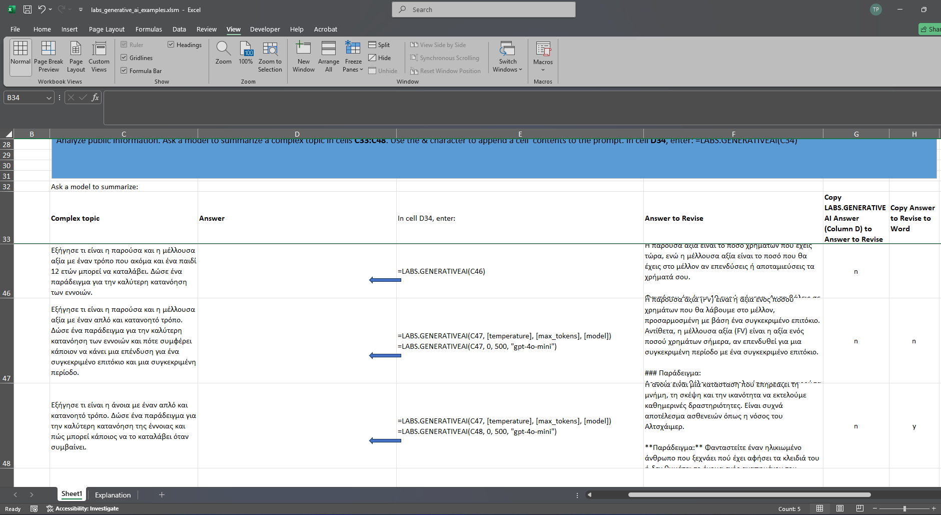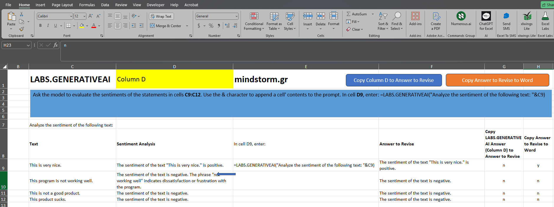 =LABS.GENERATIVEAI(“Analyze the sentiment of the following text: ” & Cx)