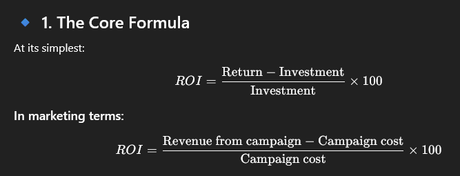 ROI in marketing isn’t complicated mathematically—but the real difficulty is defining what counts as “return” and what costs you include. I’ll break it down both formula-wise and practically.