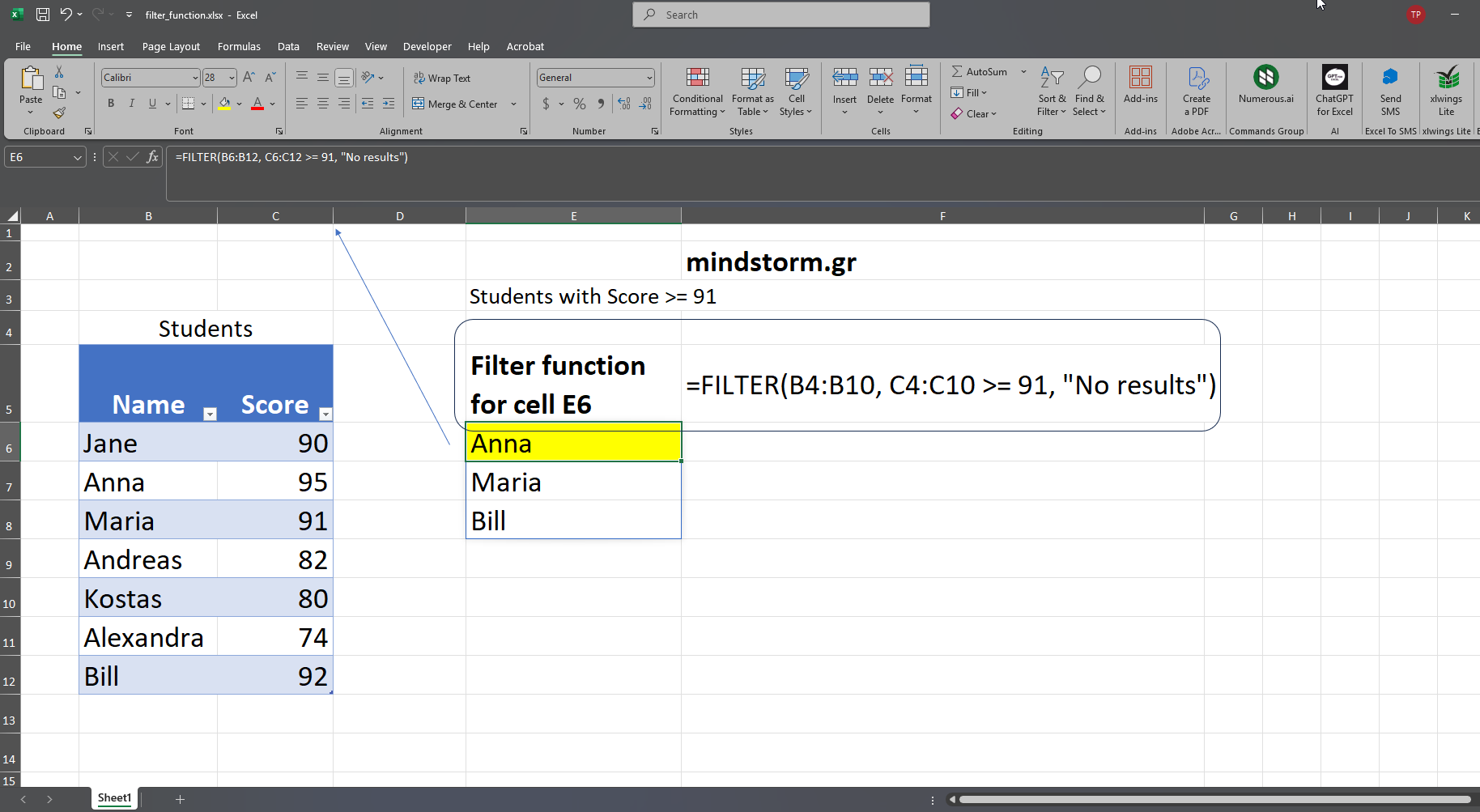 Αυτός ο τύπος φιλτράρει τη λίστα με τα ονόματα των μαθητών (B6:B12) και εμφανίζει μόνο εκείνους των οποίων οι βαθμοί (C6:C12) είναι μεγαλύτεροι ή ίσοι με 91.
