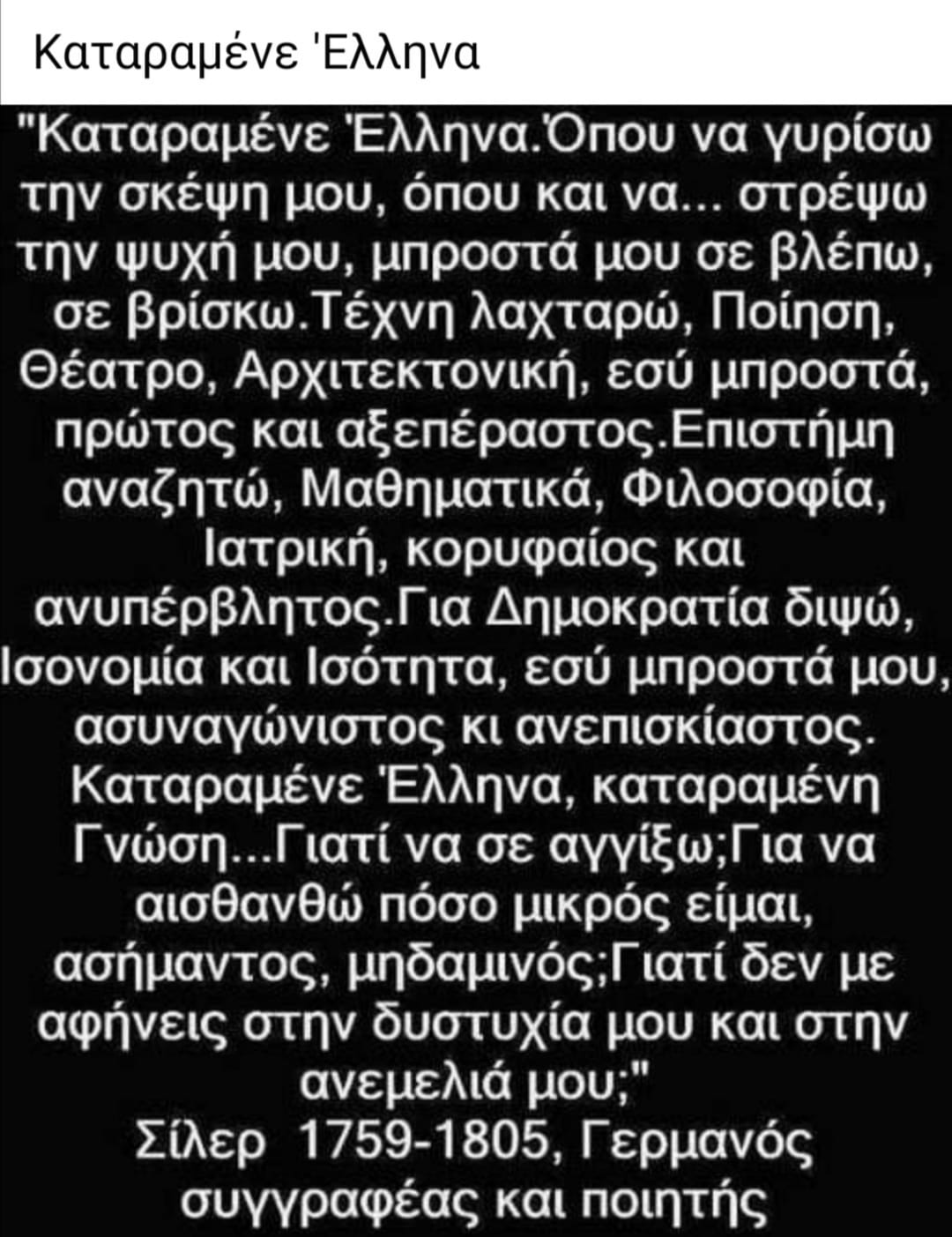 Καταραμένε Έλληνα Καταραμένη ιστορία. Μας κυνηγάς. Άλλοτε μας βοηθάς, άλλοτε μας υποτιμάς και άλλοτε μας ξεχνάς. #hellenicland / fb page : Hellenic-Land.com / www.hellenic-land.com Views: 0 ΕΛΛΑΔΑΣΚΕΨΕΙΣ Prev Post Διατίθεται απόγνωσις August 31, 2025 Next Post 7 χαρακτηριστικά που έχουν κοινά οι συναρπαστικοί άνθρωποι September 1, 2025 Related Posts - Σχετικά Άρθρα 18 Quiet Habits of Top Salespeople April 17, 2026 Στην εποχή της διάχυσης April 14, 2026 Be kind and be gentle April 14, 2026 Comments are closed.