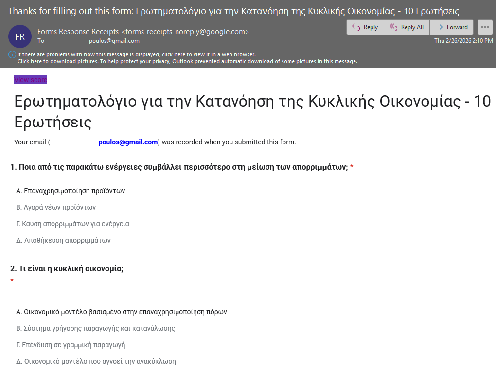 Παράδειγμα ερωτηματολογίου για την κυκλική οικονομία, με δέκα ερωτήσεις πολλαπλών επιλογών. Το ερωτηματολόγιο μπορεί να εισαχθεί σε Google Forms και Google Sheets ως εξής: