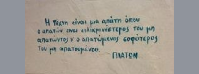Τι είναι η τέχνη; Η τέχνη είναι μια απάτη όπου ο απατών είναι ειλικρινέστερος του μη απατώντος και ο απατόμενος σοφότερος του μη απατώντος. #τέχνη #πλάτωνας #απάτη #σοφία #hellenicland Views: 0 MOTIVATIONALΕΠΙΚΟΙΝΩΝΙΑΣΚΕΨΕΙΣ Prev Post Never stop reading January 18, 2026 Next Post Προσπαθώντας να ξεφύγουμε από τα προβλήματα January 19, 2026 Related Posts - Σχετικά Άρθρα When the axe came into the forest January 20, 2026 Τελευταία κάτι παίζει January 20, 2026 Read more books January 20, 2026 Comments are closed.