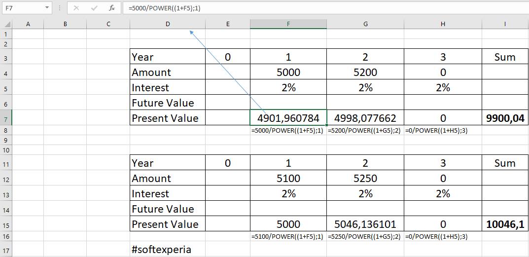 Αν στο προηγούμενο παράδειγμα η επιχείρηση υποσχόταν ότι θα δώσει στον υποψήφιο επενδυτή, για δύο συνεχή έτη από σήμερα και στο τέλος κάθε έτους 5100 ευρώ και 5250 ευρώ αντίστοιχα, τότε το Α θα ήταν μεγαλύτερο του 10000 δηλ. 10046,1 και τότε η επένδυση θα ήταν συμφέρουσα. Επίσης, αν το Α ήταν ίσο με 10000, τότε με την επένδυση αυτή δεν θα είχαμε ούτε κέρδος ούτε ζημία.