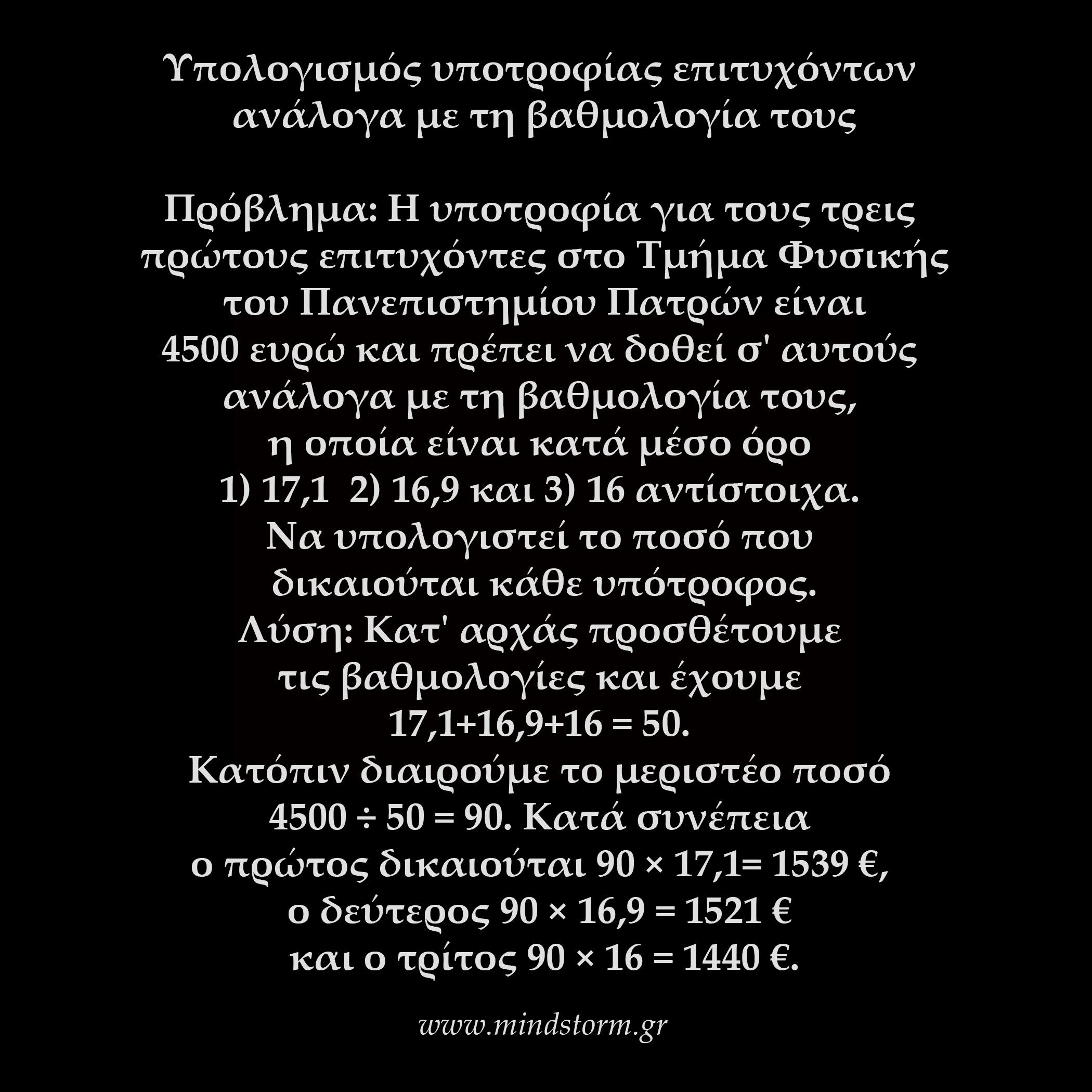 Κατά συνέπεια ο πρώτος δικαιούται 90 × 17,1= 1539 €, ο δεύτερος 90 × 16,9 = 1521 € και ο τρίτος 90 × 16 = 1440 €.